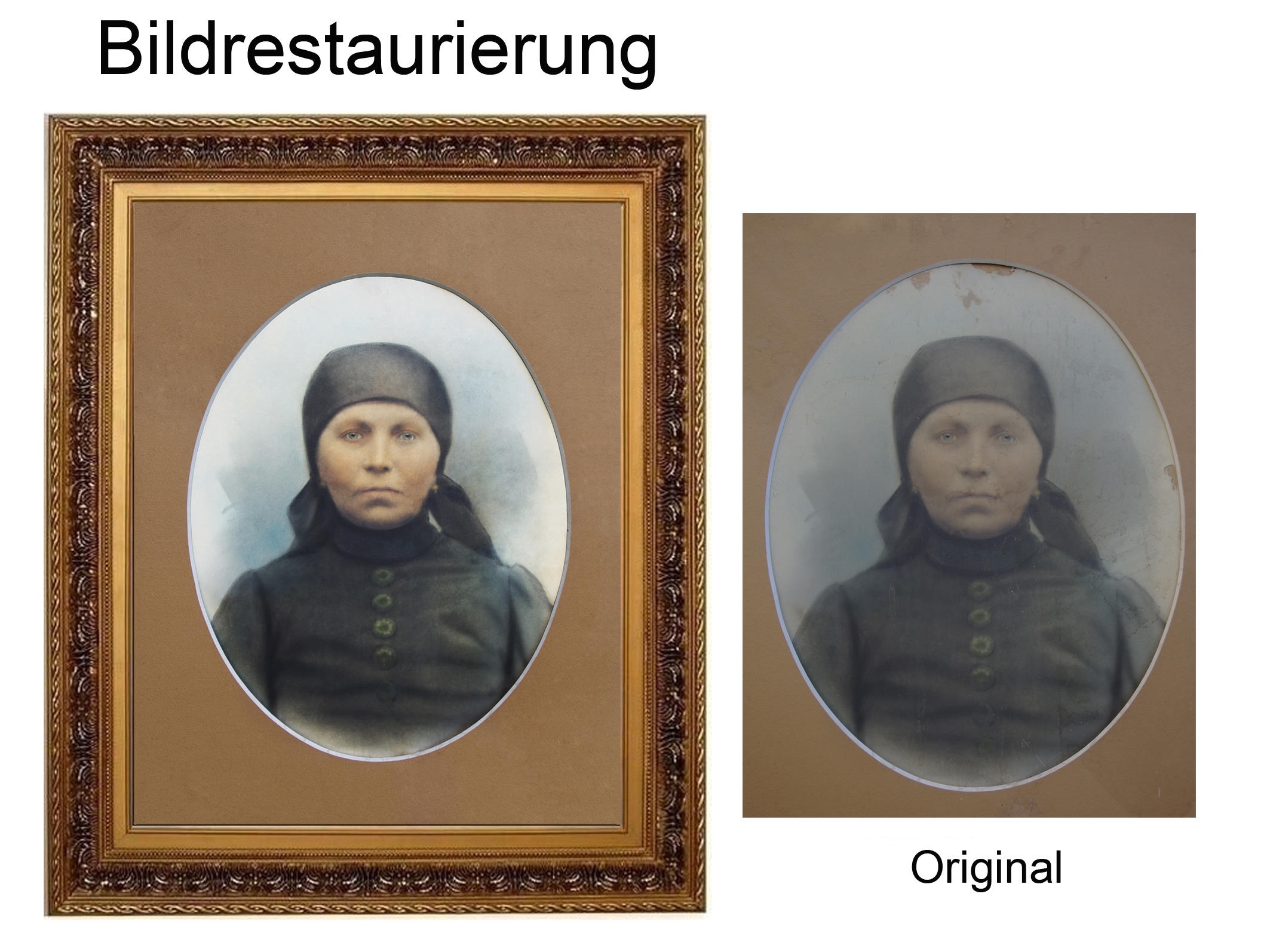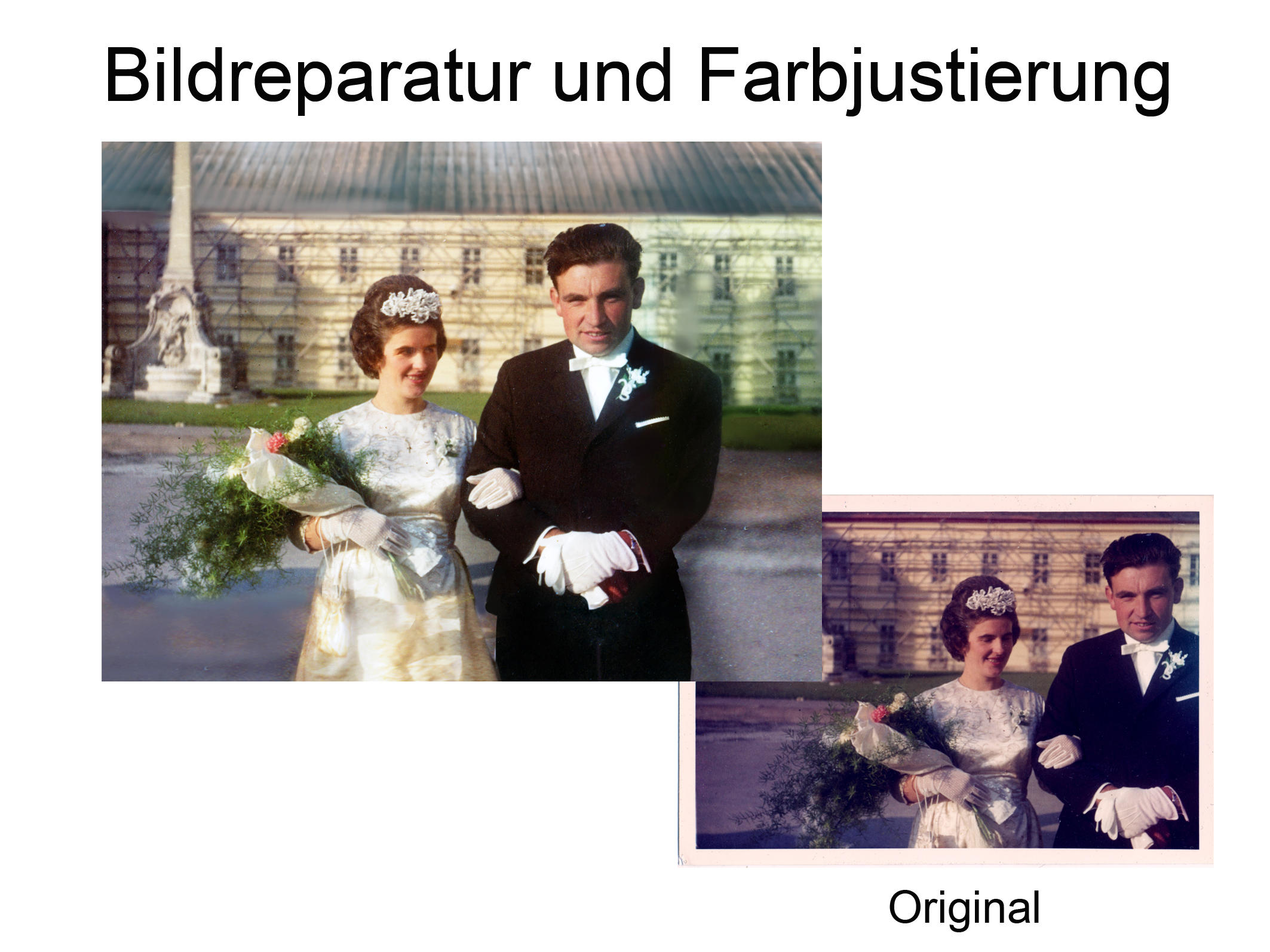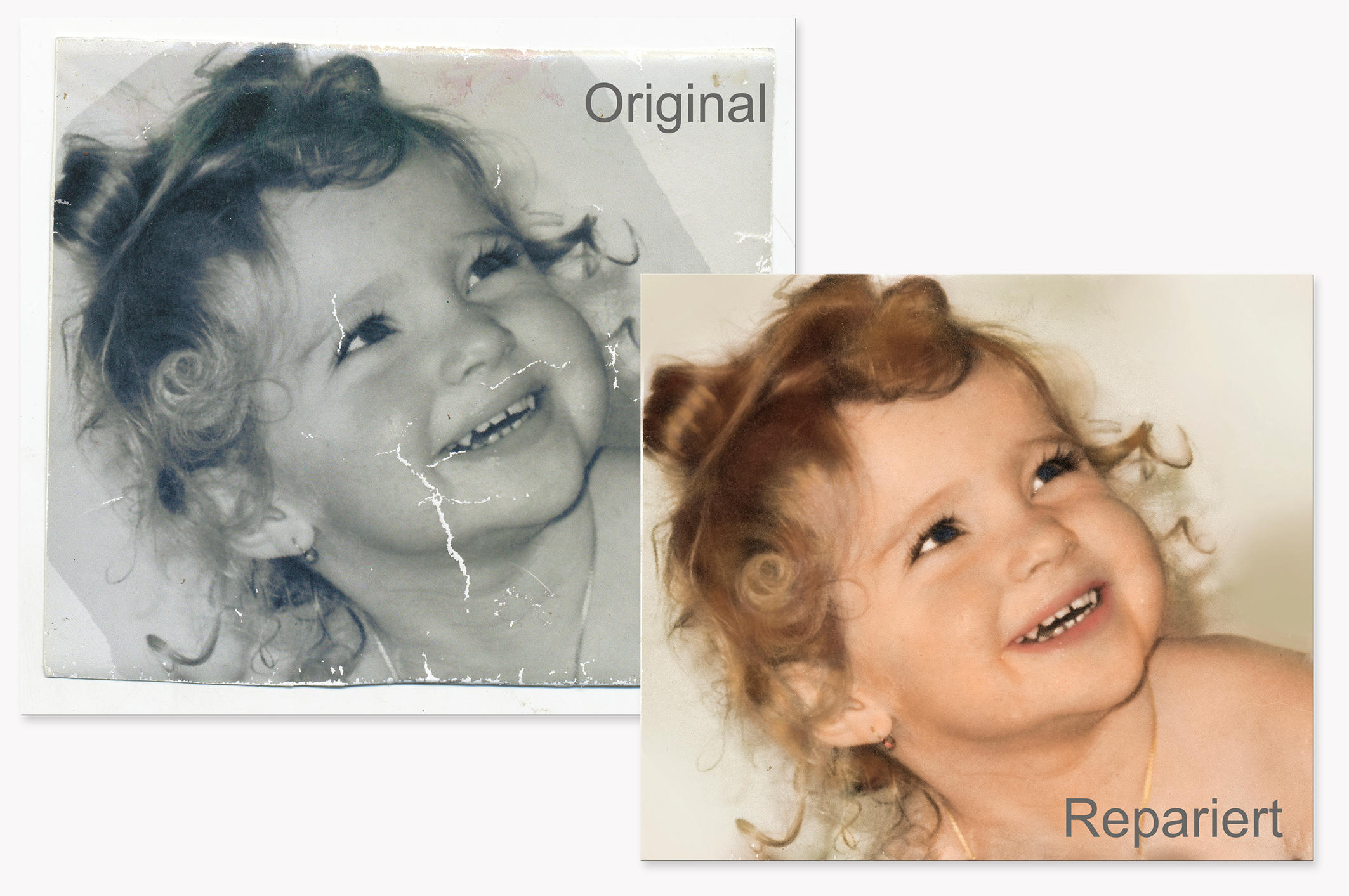 Fotorestauration von alten und beschädigten Bildern Die Fotorestauration umfasst das Retuschieren von alten und beschädigten Fotos. Wir setzen die beschädigten Bilddetails visuell in den Originalzustand zurück. Auf Wunsch fügen wir auch Farben zu alten Schwarz-Weiß-Fotos hinzu.