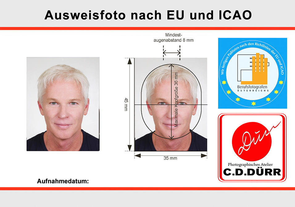 Passfoto Durch optimale Nutzung des gegeben Spielraums der visuellen Darstellung, fertigen wir , als zertifiziertes Unternehmen, sorgfältig justierte Passbilder für Reisepass, Führerschein oder die neue e-card , nach den gesetzlichen Kriterien der EU und ICAO zu sofortigen Mitnahme für Sie an.
